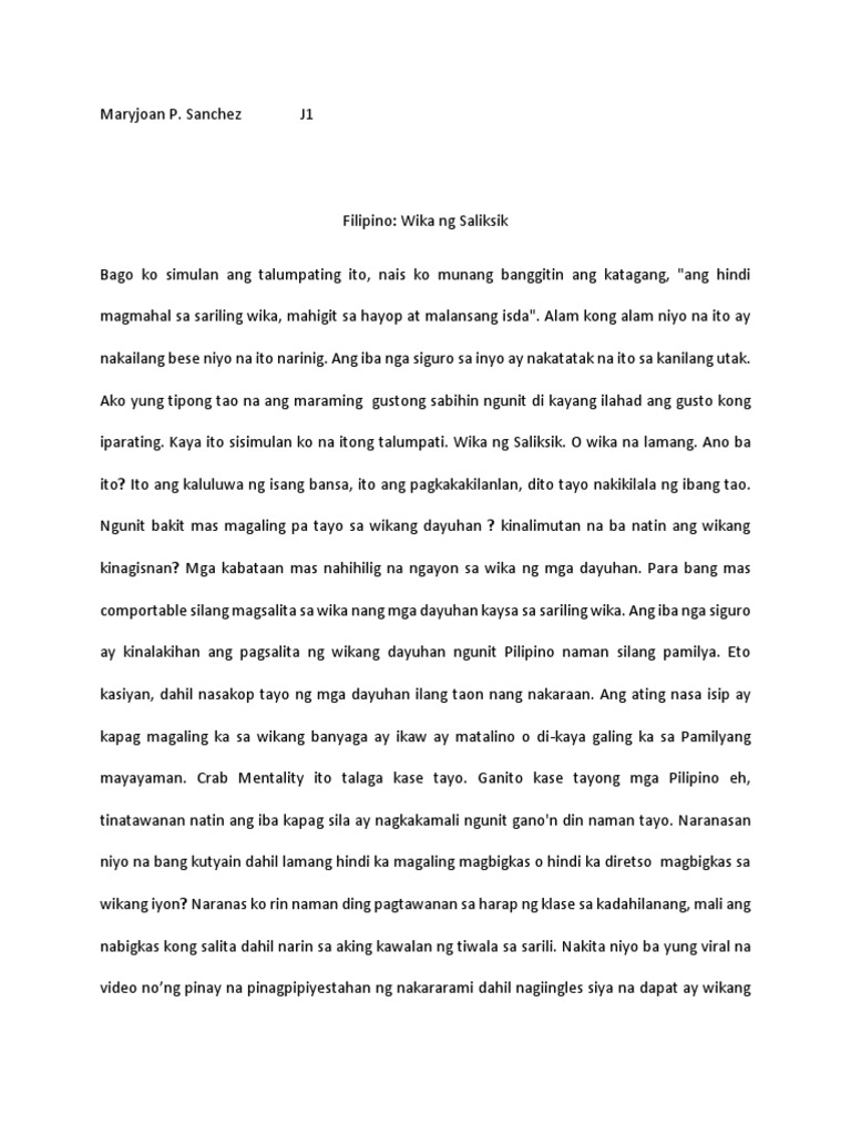 Talaga ngang wala ng ibang magmamahal sa Wikang Filipino kundi tayo ring mga Pilipino kayat halinat pagyabungin natin ang isa sa mga pinaka-iingatang yaman ng ating bansa Ang wikang Filipino. Sinasabayan natin ang trip ng isat-isa. Wikang Filipino wika ng bawat Pilipino.